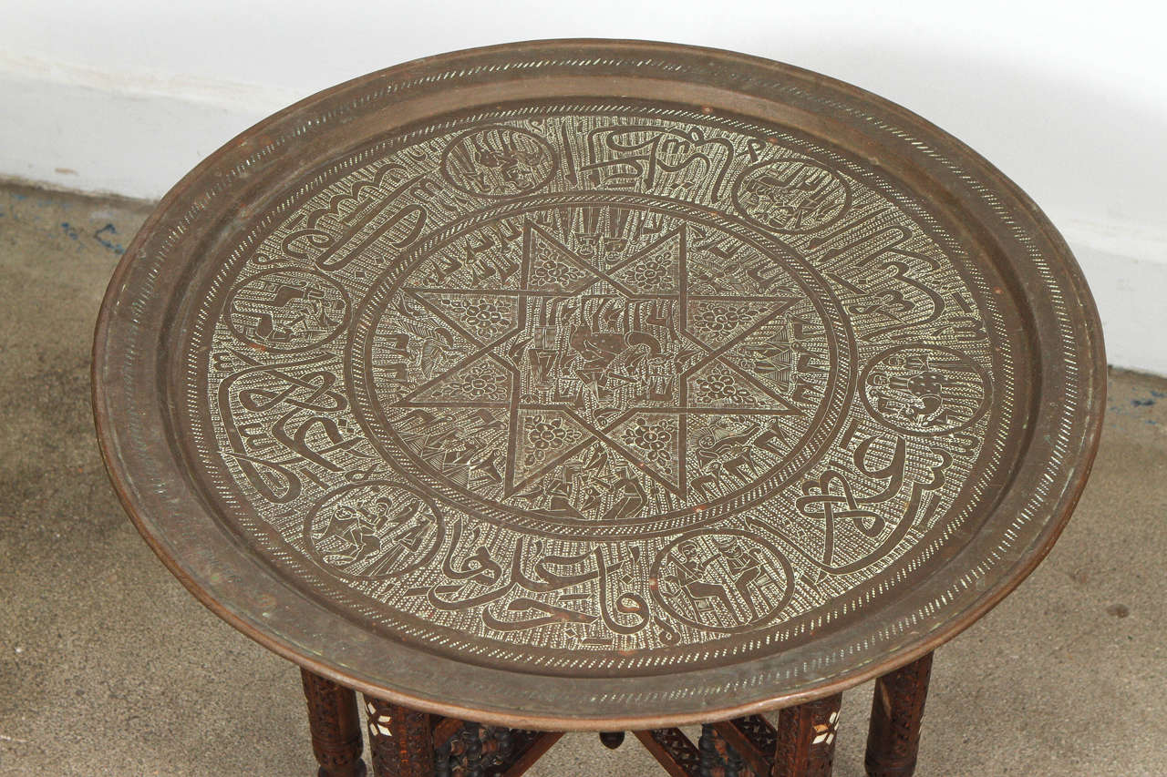 Middle Eastern Brass Tray Table on European Wood Base ... from i.ebayimg.com Bradley hubbard 19th century brass & onyx table stand gothic lion head. For example, you can buy special decorative or collectible trays the design is stamped or carved into the surface after which colored glazes are applied design: Large middle eastern brass platter in mamluk revival style, islamic inlay metal charger artwork.